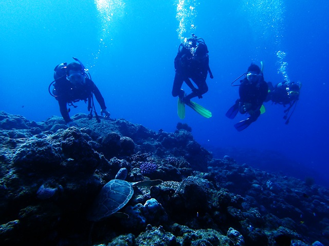 連休最終日、今日まで満員です ありがとうございます ダイバー4名様の満員♪ 今日は小さいサメ2匹登場♪ 俺様以外は遠目に大きなサメも見たそうな; なかなか逃げないから亀さんとも記念撮影♪ 今日も居ましたコブシメ♪