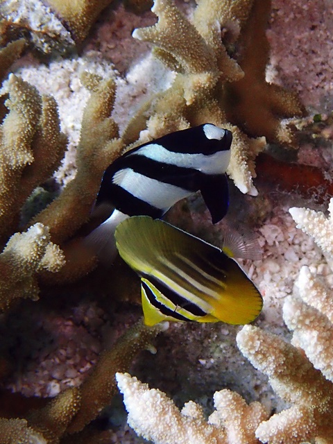 ヒレナガハギygが可愛い💛撮ったらミスジリュウキュウスズメダイも写ってくれた(⌒∇⌒)