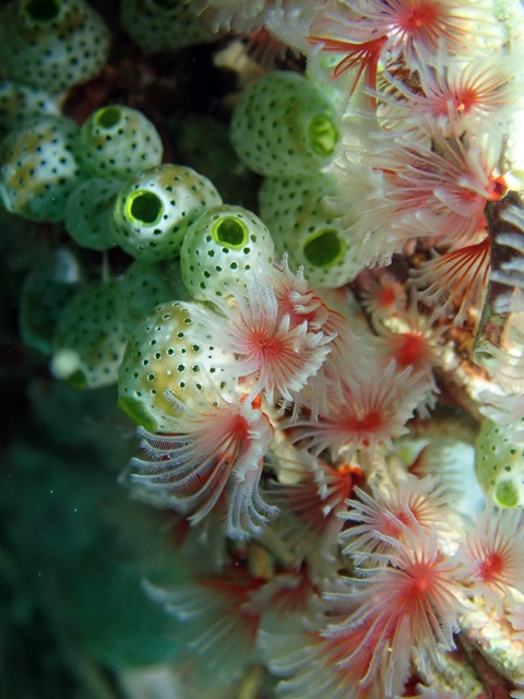 チャツボボヤの緑とオオシライトゴカイの赤とそれぞれの白が何だか綺麗に思ったので撮ってみた♡