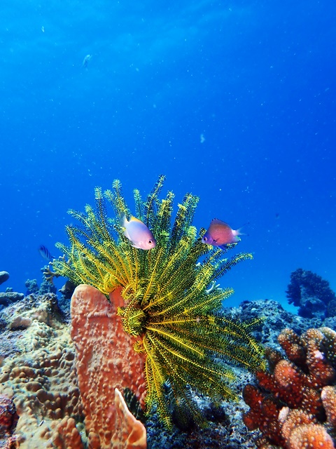 ウミシダと青い海をバックにアサドスズメダイとアマミスズメダイyg。これまた絵になるね~