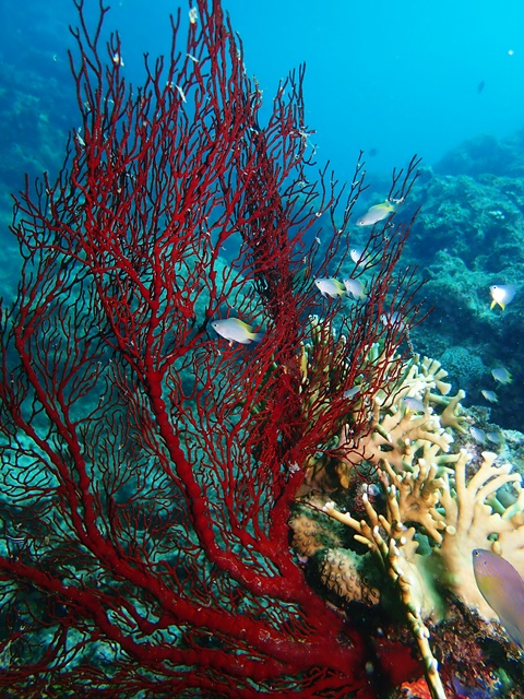 何だか今、結構居るヒレナガスズメダイ幼魚。素敵な背景で♡