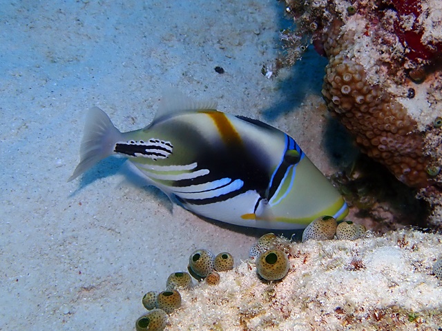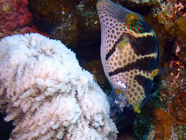 シマキンチャクフグがニセアカホシカクレエビの所でクリーニングに来てました♬