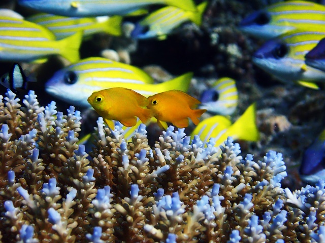 背景をヨスジフエダイにしてサンゴとネッタイスズメダイを撮ってみた