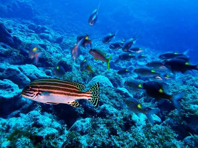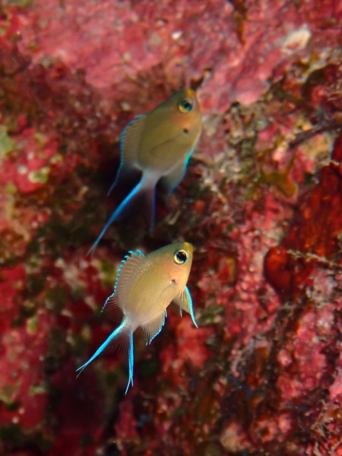 オキナワスズメダイに混ざってモンスズメダイ♡