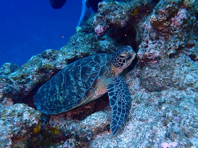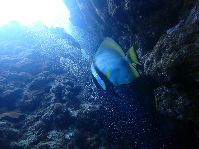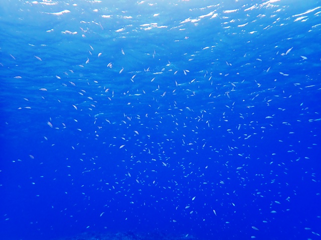 雨予報でしたがダイビング中は時々降る程度で時折太陽も見せる明るい曇り空でした
