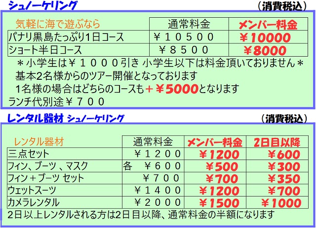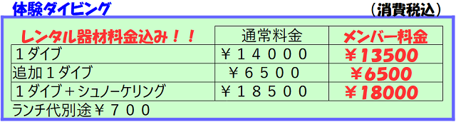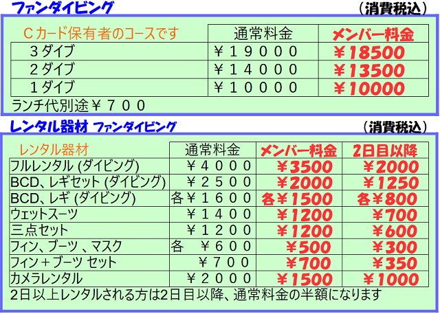 2日目以降ならフルレンタルで3ダイブ¥20500~ 2ダイブ¥15500~
